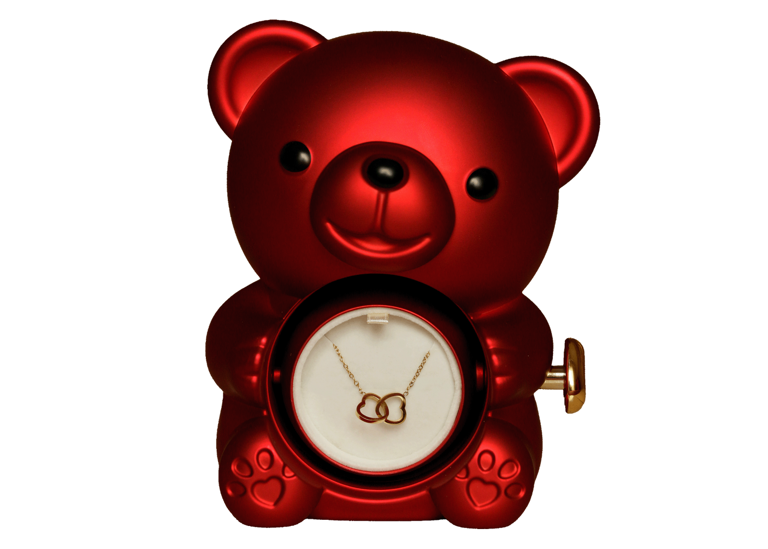 Du erhältst den Rose-Reveal Bear mit Eternal Rose im Acryl-Sichtfenster sowie die Kette nach Wahl (Doppelherz oder Einzelherz mit Stein). Die Kette wird separat im Set mitgeliefert.