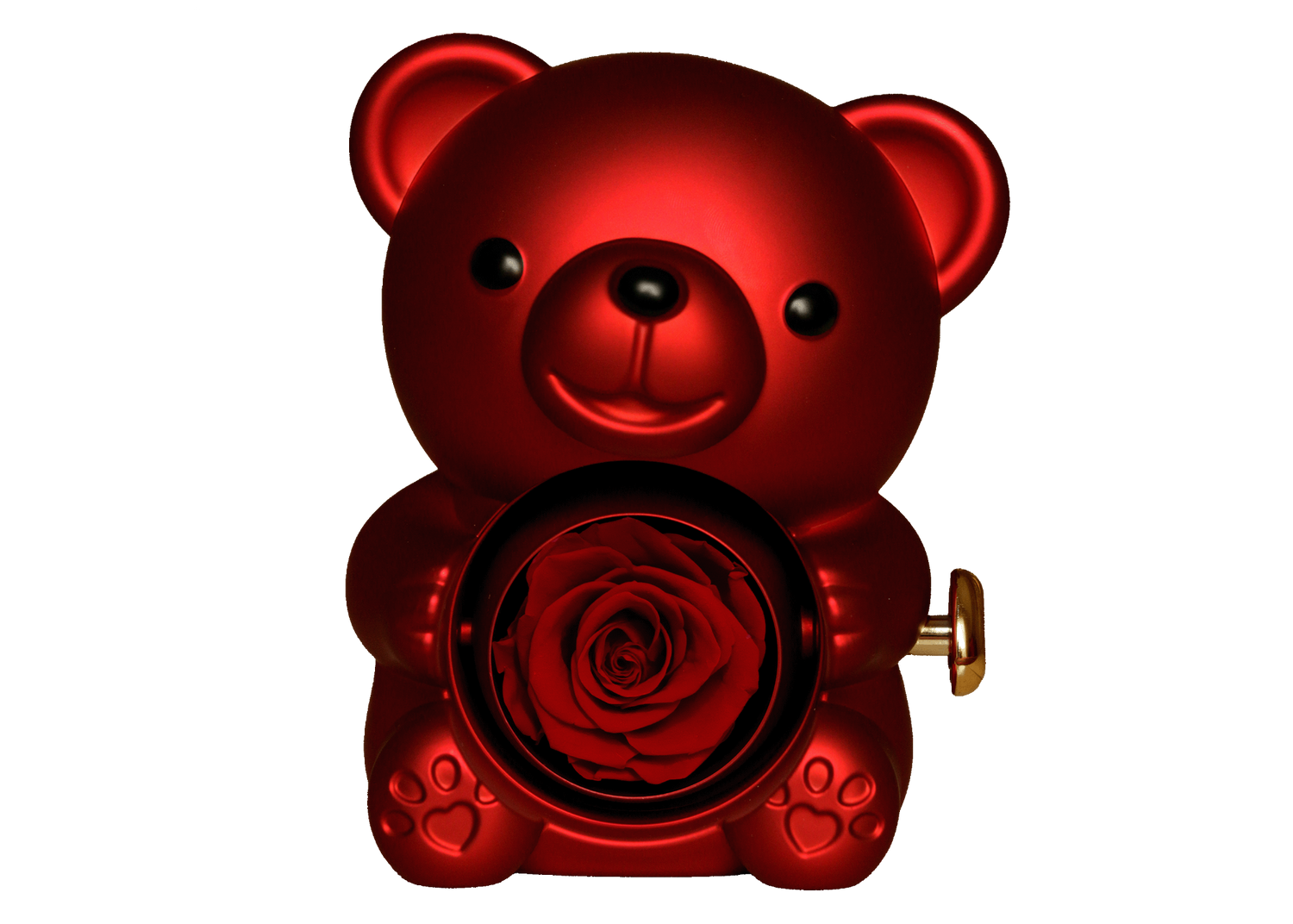 Im Herzen des Bears sitzt eine Eternal Rose – stilvoll präsentiert und hinter einer klaren Acryl-Abdeckung geschützt. Dadurch wirkt sie besonders hochwertig und bleibt gleichzeitig vor Staub und Berührung geschützt. Perfekt als Deko und als Symbol für einen Moment, der bleiben soll.